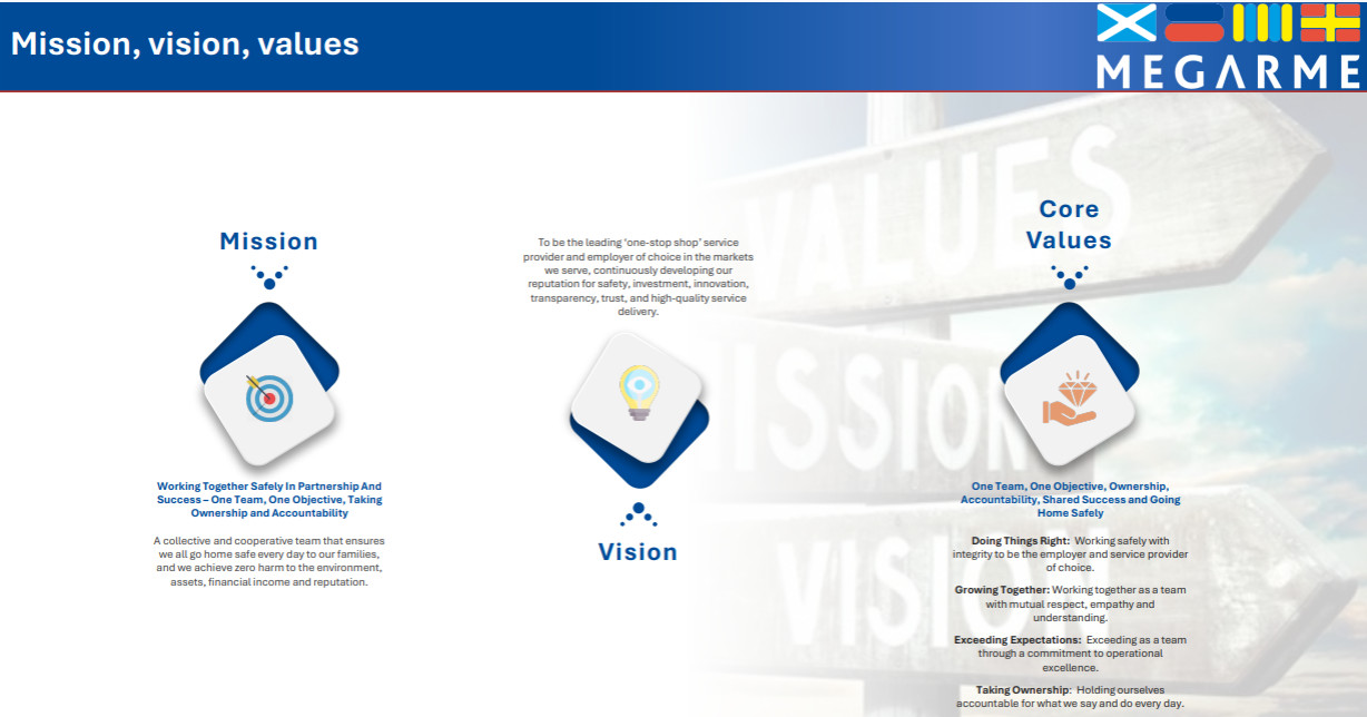 To ensure we achieve zero harm to the environment, personnel, assets, financial income and our reputation, a team that ensures we all go home safe every day to our families. Working together safely in partnership and success.