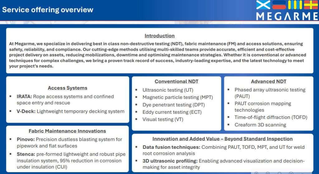 Megarme Group is a Professional IRATA Industrial Rope Access Service Provider, delivering multi-disciplined asset integrity and engineering solutions through our integrated ‘One Stop Shop’ approach within the energy industry.